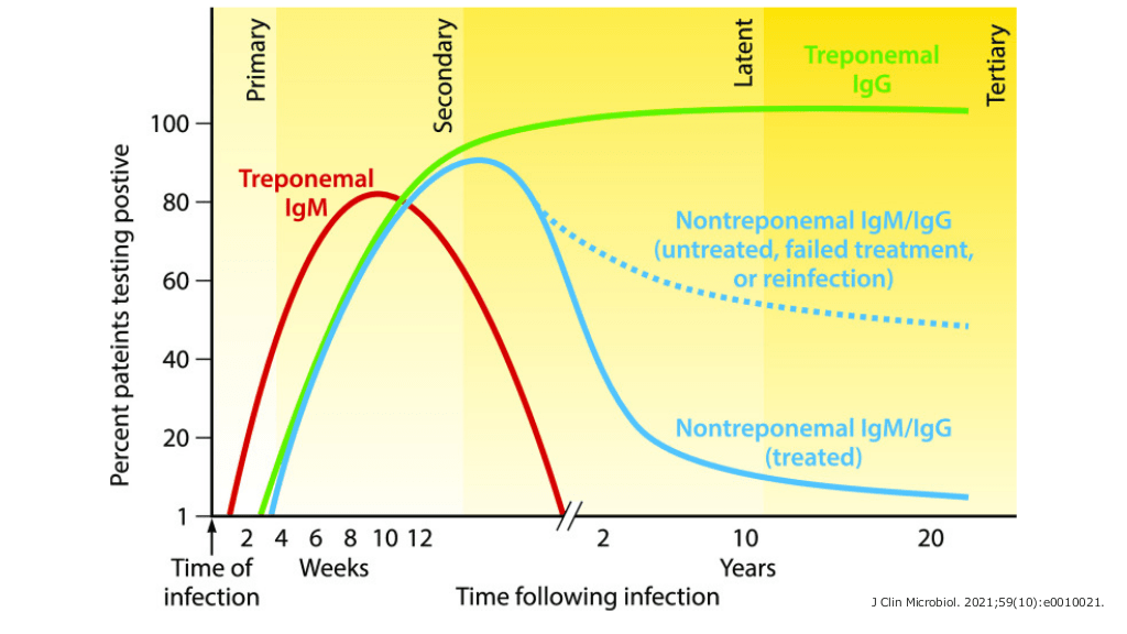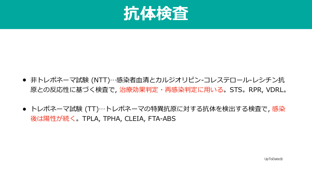 • トレポネーマ試験 (NTT)…感染者 清とカルジオリピン-コレステロール-レシチン抗 原との反応性に基づく検査で, 治療効果判定・再感染判定に いる。STS。RPR, VDRL。 • トレポネーマ試験 (TT)…トレポネーマの特異抗原に対する抗体を検出する検査で, 感染 後は陽性が続く。TPLA, TPHA, CLEIA, FTA-ABS 用 血 UpToDate ®︎ 非 抗体検査 #12.