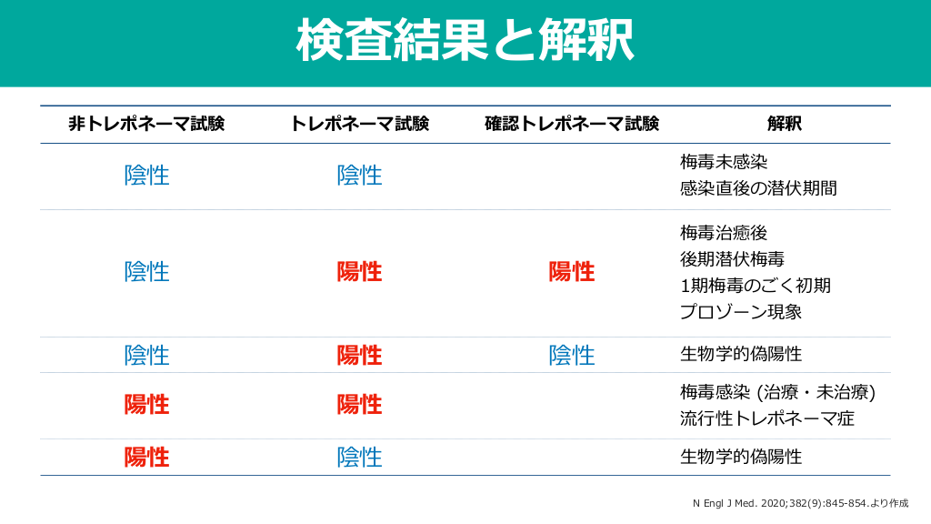 トレポネーマ試験 陰性 トレポネーマ試験 確認トレポネーマ試験 梅毒未感染 感染直後の潜伏期間 陰性 陰性 陽性 陽性 陰性 陽性 陰性 陽性 陽性 陽性 陰性 解釈 梅毒治癒後 後期潜伏梅毒 1期梅毒のごく初期 プロゾーン現象 物学的偽陽性 梅毒感染 (治療・未治療) 流 性トレポネーマ症 物学的偽陽性 N Engl J Med. 2020;382(9):845-854.より作成 行 生 非 生 検査結果と解釈 #13.