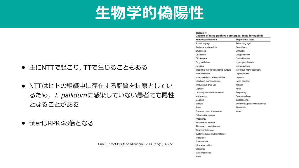 • 主にNTTで起こり, TTで • NTTはヒトの組織中に存在する脂質を抗原としてい るため,T. pallidumに感染していない患者でも陽性 となることがある • titerはRPR≦8倍となる じることもある Can J Infect Dis Med Microbiol. 2005;16(1):45-51. 生 生 物学的偽陽性 梅毒の組織学的検査と特徴 #15.
