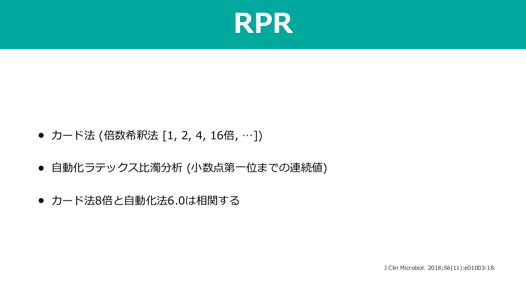 濁分析 ( 数点第 位までの連続値) カード法8倍と 動化法6.0は相関する J Clin Microbiol. 2018;56(11):e01003-18. 一 • 動化ラテックス 小 • カード法 (倍数希釈法 [1, 2, 4, 16倍, …]) 比 • 自 自 RPR #16.