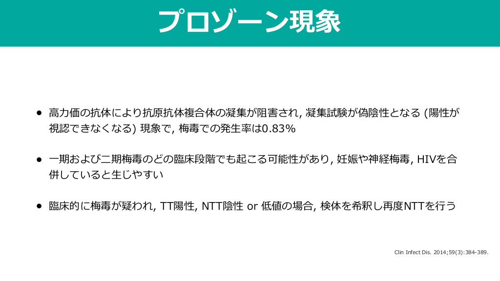 • 価の抗体により抗原抗体複合体の凝集が阻害され, 凝集試験が偽陰性となる (陽性が 視認できなくなる) 現象で, 梅毒での発 率は0.83% • 期および 期梅毒のどの臨床段階でも起こる可能性があり, 妊娠や神経梅毒, HIVを合 併していると じやすい • 臨床的に梅毒が疑われ, TT陽性, NTT陰性 or 低値の場合, 検体を希釈し再度NTTを う 行 生 生 二 Clin Infect Dis. 2014;59(3):384-389. 力 高 一 プロゾーン現象 #17.