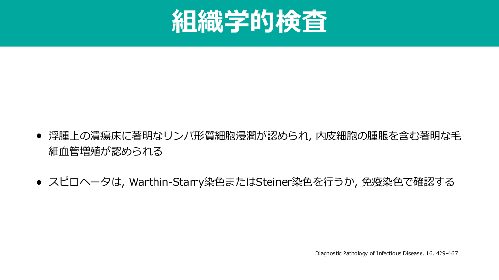 組織学的検査 • 浮腫上の潰瘍床に著明なリンパ形質細胞浸潤が認められ, 内 細 管増殖が認められる • スピロヘータは, Warthin-Starry染 またはSteiner染 細胞の腫脹を含む著明な を うか, 免疫染 で確認する 毛 色 皮 行 色 色 血 Diagnostic Pathology of Infectious Disease, 16, 429-467 #18.