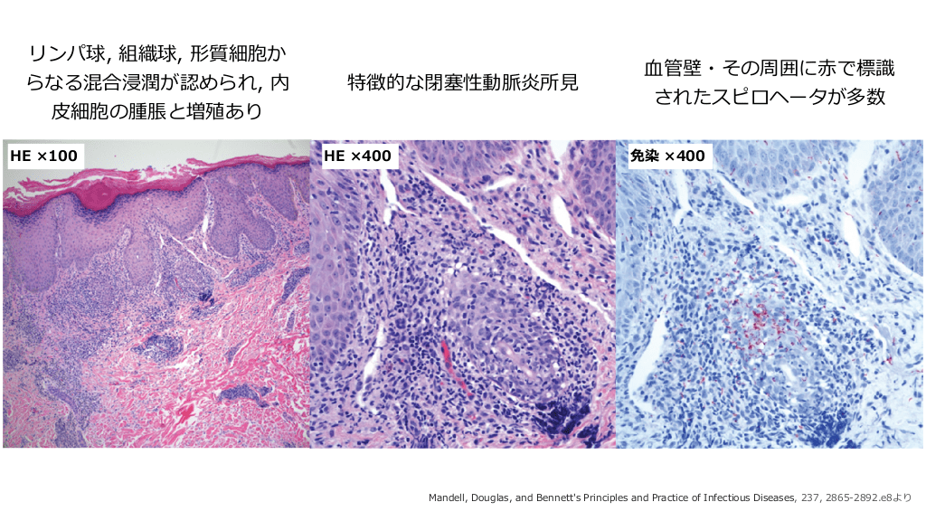 HE ×100 特徴的な閉塞性動脈炎所 HE ×400 管壁・その周囲に で標識 されたスピロヘータが多数 免染 ×400 見 Mandell, Douglas, and Bennett's Principles and Practice of Infectious Diseases, 237, 2865-2892.e8より 赤 血 皮 リンパ球, 組織球, 形質細胞か らなる混合浸潤が認められ, 内 細胞の腫脹と増殖あり 梅毒の各期の症状と診断 #19.