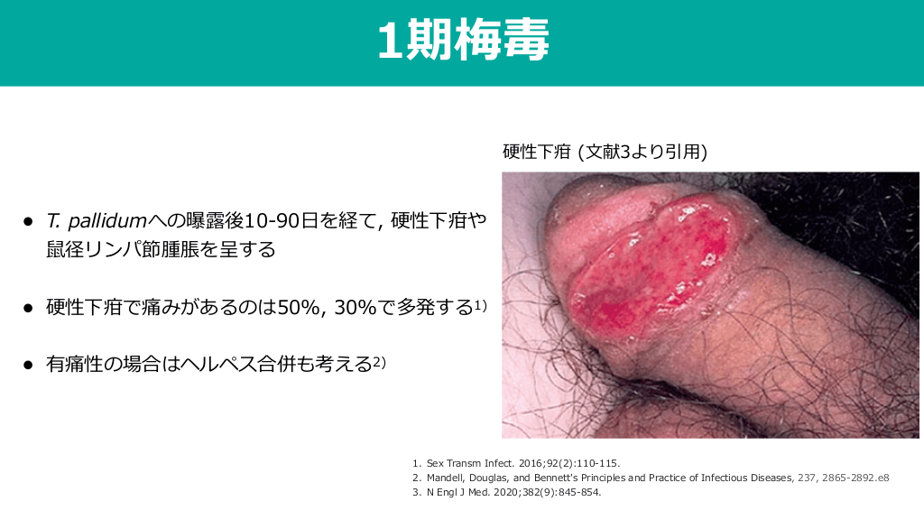 硬性下疳 ( • T. pallidumへの曝露後10-90 径リンパ節腫脹を呈する • 硬性下疳で痛みがあるのは50%, 30%で多発する1) • 有痛性の場合はヘルペス合併も考える2) 献3より引 ) を経て, 硬性下疳や 日 用 1. Sex Transm Infect. 2016;92(2):110-115. 2. Mandell, Douglas, and Bennett's Principles and Practice of Infectious Diseases, 237, 2865-2892.e8 3. N Engl J Med. 2020;382(9):845-854. 文 鼠 1期梅毒 #20.