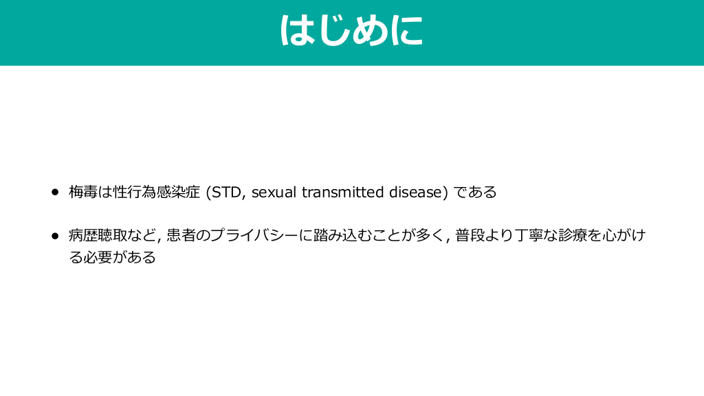 はじめに 梅毒は性 • 病歴聴取など, 患者のプライバシーに踏み込むことが多く, 普段より丁寧な診療を る必要がある 為感染症 (STD, sexual transmitted disease) である 心 行 • がけ #3.