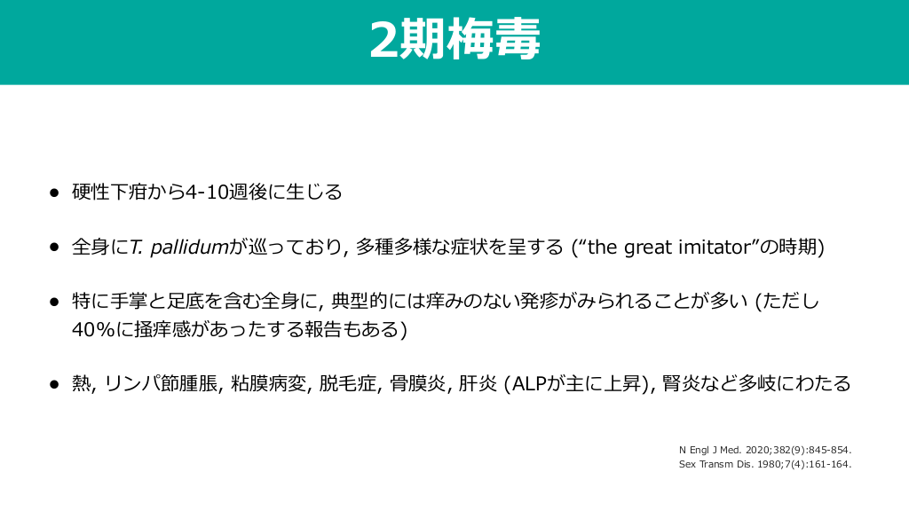 2期梅毒 • 硬性下疳から4-10週後に じる • 全 • 特に 掌と 底を含む全 に, 典型的には痒みのない発疹がみられることが多い (ただし 40%に掻痒感があったする報告もある) • 熱, リンパ節腫脹, 粘膜病変, 脱 にT. pallidumが巡っており, 多種多様な症状を呈する (“the great imitator”の時期) 症, 膜炎, 肝炎 (ALPが主に上昇), 腎炎など多岐にわたる 骨 毛 生 身 足 手 身 N Engl J Med. 2020;382(9):845-854. Sex Transm Dis. 1980;7(4):161-164. #21.