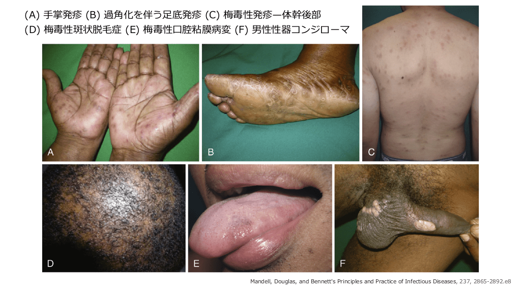 (A) 掌発疹 (B) 過 化を伴う 底発疹 (C) 梅毒性発疹 体幹後部 (D) 梅毒性斑状脱 症 (E) 梅毒性 腔粘膜病変 (F) 男性性器コンジローマ — 口 足 毛 角 手 Mandell, Douglas, and Bennett's Principles and Practice of Infectious Diseases, 237, 2865-2892.e8 #22.