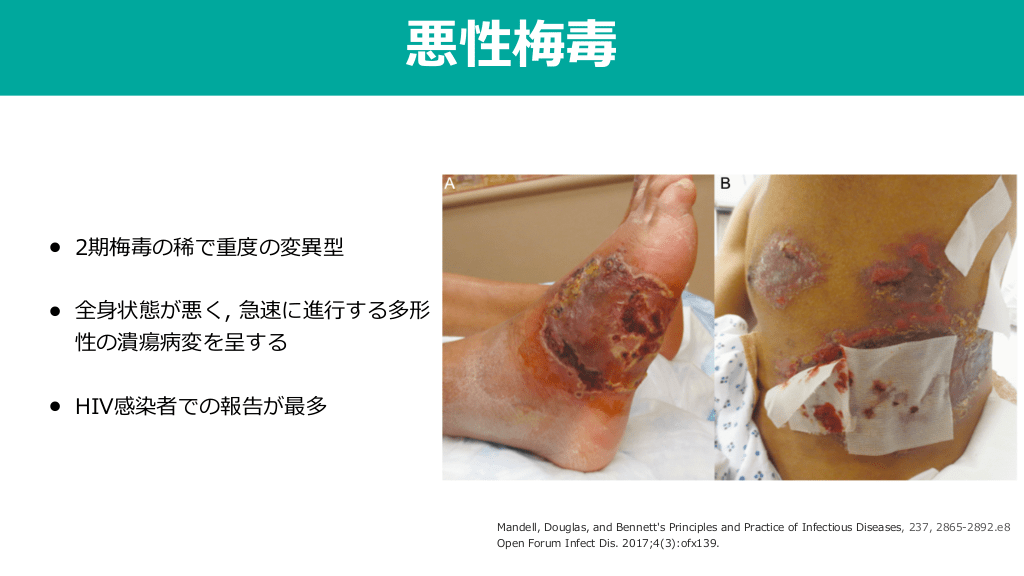 悪性梅毒 • 2期梅毒の稀で重度の変異型 • 全 状態が悪く, 急速に進 性の潰瘍病変を呈する • HIV感染者での報告が最多 する多形 行 身 Mandell, Douglas, and Bennett's Principles and Practice of Infectious Diseases, 237, 2865-2892.e8 Open Forum Infect Dis. 2017;4(3):ofx139. 潜在梅毒と神経梅毒の理解 #23.