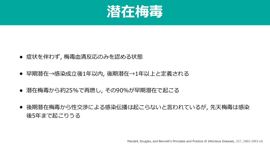 潜在梅毒 • 症状を伴わず, 梅毒 • 早期潜在→感染成 • 潜在梅毒から約25%で再燃し, その90%が早期潜在で起こる • 後期潜在梅毒から性交渉による感染伝播は起こらないと 後5年まで起こりうる 清反応のみを認める状態 後1年以内, 後期潜在→1年以上と定義される われているが, 先天梅毒は感染 言 血 立 Mandell, Douglas, and Bennett's Principles and Practice of Infectious Diseases, 237, 2865-2892.e8 #24.