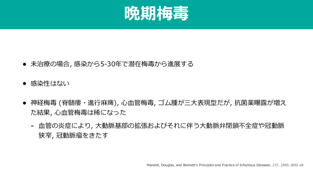 • 未治療の場合, 感染から5-30年で潜在梅毒から進展する • 感染性はない • 神経梅毒 (脊髄瘻・進 痺), た結果, 管梅毒は稀になった - 管梅毒, ゴム腫が三 表現型だが, 抗菌薬曝露が増え 管の炎症により, 動脈基部の拡張およびそれに伴う 狭窄, 冠動脈瘤をきたす 動脈弁閉鎖不全症や冠動脈 大 大 血 心 麻 行 大 血 Mandell, Douglas, and Bennett's Principles and Practice of Infectious Diseases, 237, 2865-2892.e8 心 血 晩期梅毒 #25.