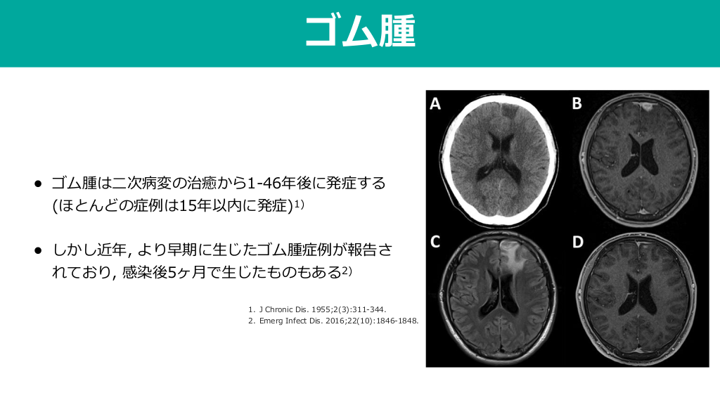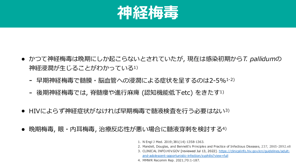 ゴム腫 • ゴム腫は 次病変の治癒から1-46年後に発症する (ほとんどの症例は15年以内に発症)1) • しかし近年, より早期に じたゴム腫症例が報告さ れており, 感染後5ヶ で じたものもある2) 生 生 月 二 1. J Chronic Dis. 1955;2(3):311-344. 2. Emerg Infect Dis. 2016;22(10):1846-1848. #26. 神経梅毒 • かつて神経梅毒は晩期にしか起こらないとされていたが, 現在は感染初期からT. pallidumの 神経浸潤が じることがわかっている1) - 早期神経梅毒で髄膜・脳 - 後期神経梅毒では, 脊髄瘻や進 管への浸潤による症状を呈するのは2-5%1-2) 痺 (認知機能低下etc) をきたす1) • HIVによらず神経症状がなければ早期梅毒で髄液検査を う必要はない3) • 晩期梅毒, 眼・内 梅毒, 治療反応性が悪い場合に髄液穿刺を検討する4) 1. N Engl J Med. 2019;381(14):1358-1363. 2. Mandell, Douglas, and Bennett's Principles and Practice of Infectious Diseases, 237, 2865-2892.e8 行 麻 行 血 耳 生 3. CLINICAL INFO.HIV.GOV [reviewed Jul 13, 2022]. https://clinicalinfo.hiv.gov/en/guidelines/adultand-adolescent-opportunistic-infection/syphilis?view=full 4. MMWR Recomm Rep. 2021;70:1-187. 梅毒の治療法と薬剤感受性 #27.