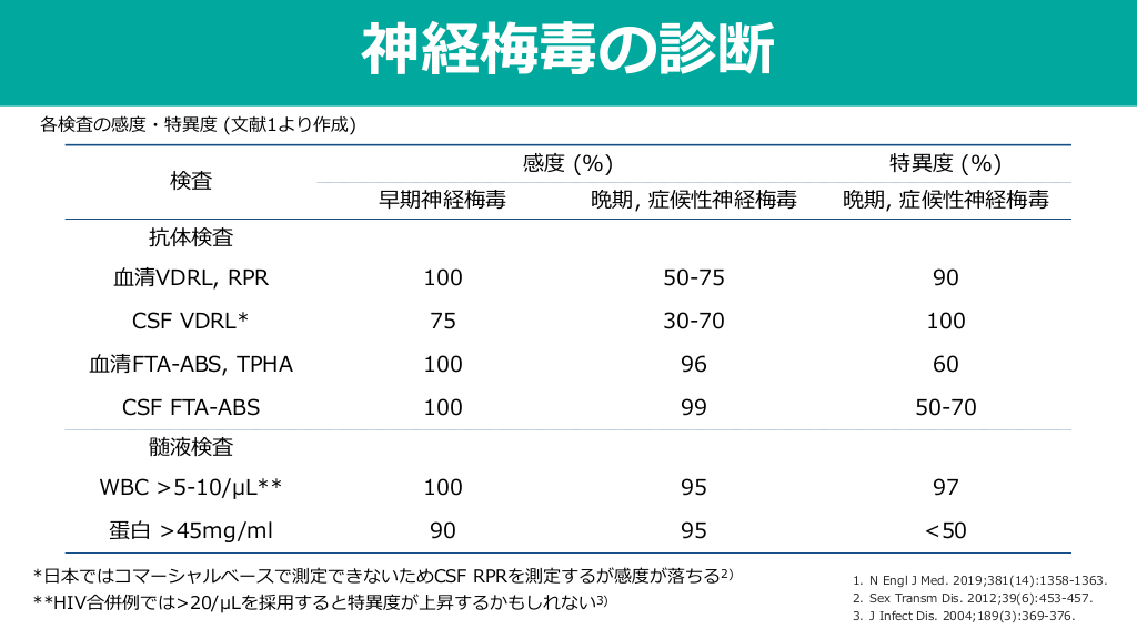 各検査の感度・特異度 ( 献1より作成) 感度 (%) 検査 特異度 (%) 早期神経梅毒 晩期, 症候性神経梅毒 晩期, 症候性神経梅毒 100 50-75 90 75 30-70 100 100 96 60 100 99 50-70 100 95 97 90 95 <50 抗体検査 清VDRL, RPR CSF VDRL* 清FTA-ABS, TPHA CSF FTA-ABS 髄液検査 WBC >5-10/μL** 蛋 >45mg/ml 用 文 白 * 本ではコマーシャルベースで測定できないためCSF RPRを測定するが感度が落ちる2) **HIV合併例では>20/μLを採 すると特異度が上昇するかもしれない3) 日 血 血 神経梅毒の診断 1. N Engl J Med. 2019;381(14):1358-1363. 2. Sex Transm Dis. 2012;39(6):453-457. 3. J Infect Dis. 2004;189(3):369-376. #28.