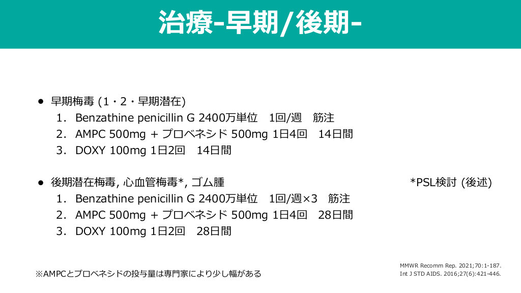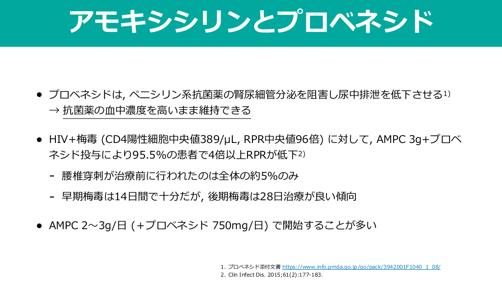 治療-早期/後期• 早期梅毒 (1・2・早期潜在) 1. Benzathine penicillin G 2400万単位 1回/週 筋注 2. AMPC 500mg + プロベネシド 500mg 1 4回 14 間 3. DOXY 100mg 1 2回 14 間 • 後期潜在梅毒, 管梅毒*, ゴム腫 1. Benzathine penicillin G 2400万単位 1回/週×3 筋注 2. AMPC 500mg + プロベネシド 500mg 1 4回 28 間 3. DOXY 100mg 1 2回 28 間 日 日 日 日 門 日 日 血 日 日 心 ※AMPCとプロベネシドの投与量は専 家により少し幅がある *PSL検討 (後述) MMWR Recomm Rep. 2021;70:1-187. Int J STD AIDS. 2016;27(6):421-446. #29. アモキシシリンとプロベネシド • プロベネシドは, ペニシリン系抗菌薬の腎尿細管分泌を阻害し尿中排泄を低下させる1) → 抗菌薬の 中濃度を いまま維持できる • HIV+梅毒 (CD4陽性細胞中央値389/μL, RPR中央値96倍) に対して, AMPC 3g+プロベ ネシド投与により95.5%の患者で4倍以上RPRが低下2) • - 腰椎穿刺が治療前に われたのは全体の約5%のみ - 早期梅毒は14 分だが, 後期梅毒は28 AMPC 2〜3g/ 間で (+プロベネシド 750mg/ 治療が良い傾向 ) で開始することが多い 日 日 高 十 行 日 日 血 文 1. プロベネシド添付 書 https://www.info.pmda.go.jp/go/pack/3942001F1040_1_08/ 2. Clin Infect Dis. 2015;61(2):177-183. #30.