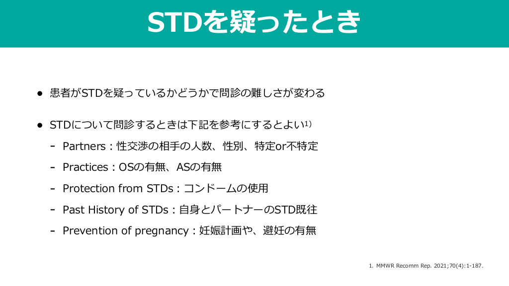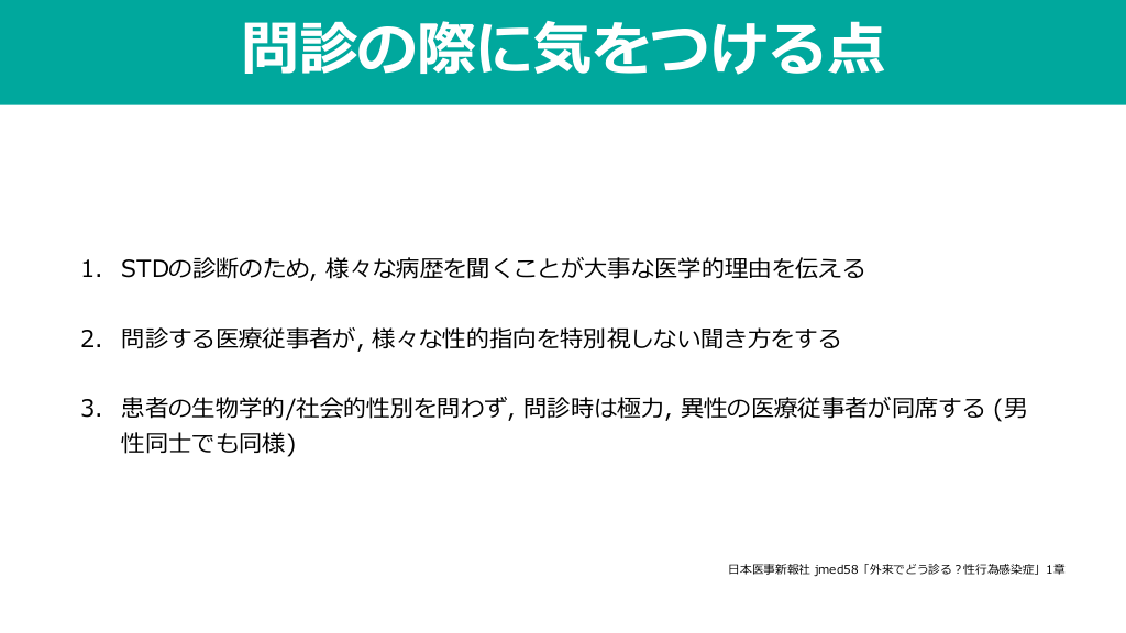 1. STDの診断のため, 様々な病歴を聞くことが 事な医学的理由を伝える 2. 問診する医療従事者が, 様々な性的指向を特別視しない聞き 3. 患者の 物学的/社会的性別を問わず, 問診時は極 性同 でも同様) をする , 異性の医療従事者が同席する (男 方 力 大 行 生 本医事新報社 jmed58「外来でどう診る?性 士 日 問診の際に気をつける点 為感染症」1章 #5.