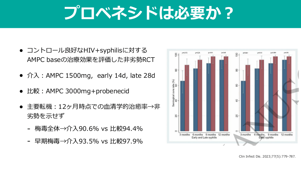 • コントロール良好なHIV+syphilisに対する AMPC baseの治療効果を評価した 劣勢RCT • 介 • • :AMPC 1500mg, early 14d, late 28d 較:AMPC 3000mg+probenecid 主要転機:12ヶ 時点での 劣勢を せず 清学的治癒率→ - 梅毒全体→介 90.6% vs 較94.4% - 早期梅毒→介 93.5% vs 較97.9% 非 非 血 比 比 月 入 入 示 Clin Infect Dis. 2023;77(5):779-787. 入 比 プロベネシドは必要か? 神経梅毒の治療と管理 #31.