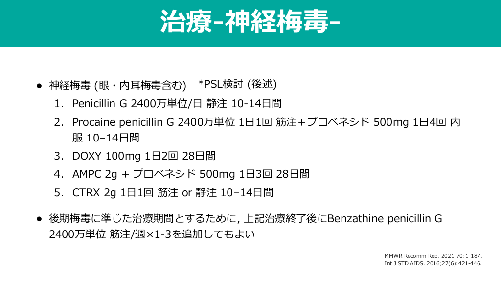 治療-神経梅毒• *PSL検討 (後述) 神経梅毒 (眼・内 梅毒含む) 1. Penicillin G 2400万単位/ 静注 10-14 2. Procaine penicillin G 2400万単位 1 服 10–14 間 3. DOXY 100mg 1 2回 28 • 1回 筋注+プロベネシド 500mg 1 4回 内 間 4. AMPC 2g + プロベネシド 500mg 1 5. CTRX 2g 1 間 1回 筋注 or 静注 10–14 3回 28 間 間 後期梅毒に準じた治療期間とするために, 上記治療終了後にBenzathine penicillin G 2400万単位 筋注/週×1-3を追加してもよい 日 日 日 日 日 日 日 日 耳 日 日 日 MMWR Recomm Rep. 2021;70:1-187. Int J STD AIDS. 2016;27(6):421-446. #32.