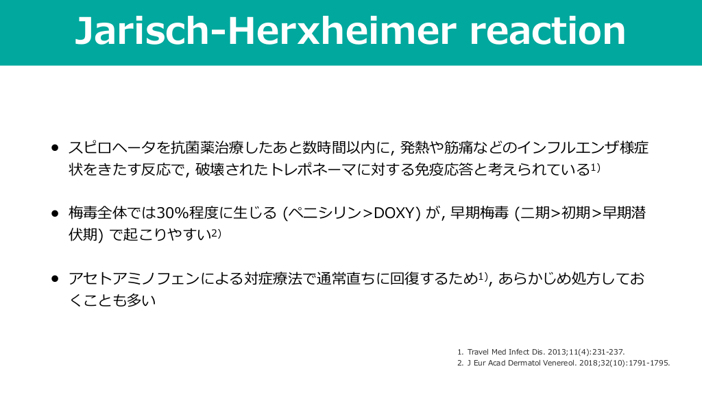 Jarisch-Herxheimer reaction • スピロヘータを抗菌薬治療したあと数時間以内に, 発熱や筋痛などのインフルエンザ様症 状をきたす反応で, 破壊されたトレポネーマに対する免疫応答と考えられている1) • 梅毒全体では30%程度に 伏期) で起こりやすい2) • アセトアミノフェンによる対症療法で通常直ちに回復するため1), あらかじめ処 くことも多い じる (ペニシリン>DOXY) が, 早期梅毒 ( 期>初期>早期潜 してお 方 二 生 1. Travel Med Infect Dis. 2013;11(4):231-237. 2. J Eur Acad Dermatol Venereol. 2018;32(10):1791-1795. #33.