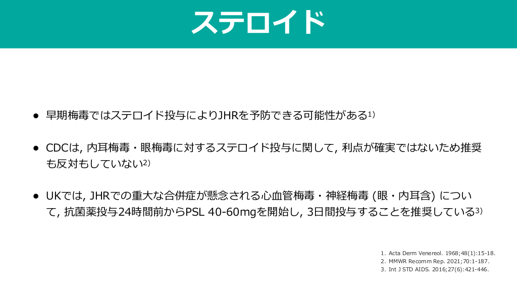 ステロイド • 早期梅毒ではステロイド投与によりJHRを予防できる可能性がある1) • CDCは, 内 梅毒・眼梅毒に対するステロイド投与に関して, 利点が確実ではないため推奨 も反対もしていない2) • UKでは, JHRでの重 な合併症が懸念される 管梅毒・神経梅毒 (眼・内 含) につい て, 抗菌薬投与24時間前からPSL 40-60mgを開始し, 3 間投与することを推奨している3) 耳 日 血 心 大 耳 1. Acta Derm Venereol. 1968;48(1):15-18. 2. MMWR Recomm Rep. 2021;70:1-187. 3. Int J STD AIDS. 2016;27(6):421-446. #34.