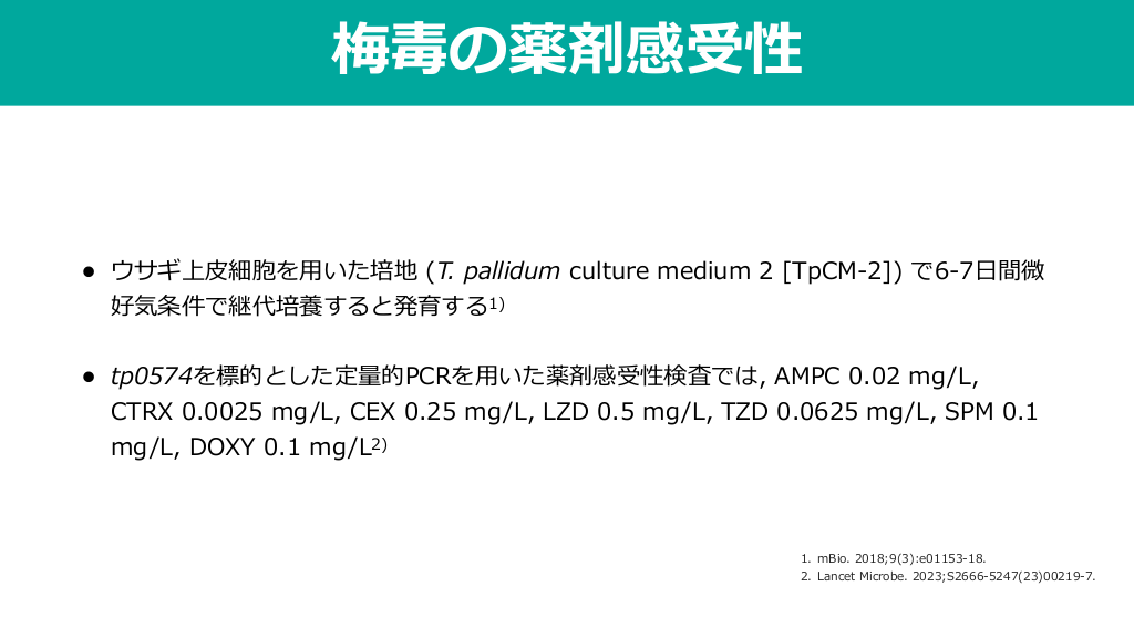 梅毒の薬剤感受性 • ウサギ上 細胞を いた培地 (T. pallidum culture medium 2 [TpCM-2]) で6-7 好気条件で継代培養すると発育する1) • tp0574を標的とした定量的PCRを いた薬剤感受性検査では, AMPC 0.02 mg/L, CTRX 0.0025 mg/L, CEX 0.25 mg/L, LZD 0.5 mg/L, TZD 0.0625 mg/L, SPM 0.1 mg/L, DOXY 0.1 mg/L2) 間微 1. mBio. 2018;9(3):e01153-18. 日 用 用 皮 2. Lancet Microbe. 2023;S2666-5247(23)00219-7. 妊婦梅毒のリスクと治療法 #35.