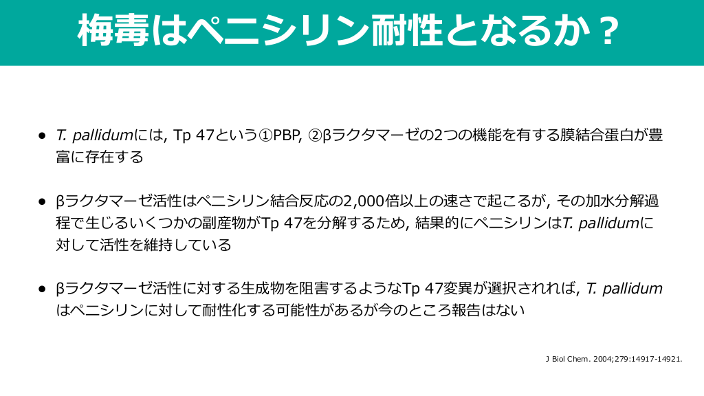 梅毒はペニシリン耐性となるか? • T. pallidumには, Tp 47という①PBP, ②βラクタマーゼの2つの機能を有する膜結合蛋 富に存在する • βラクタマーゼ活性はペニシリン結合反応の2,000倍以上の速さで起こるが, その加 分解過 程で じるいくつかの副産物がTp 47を分解するため, 結果的にペニシリンはT. pallidumに 対して活性を維持している • βラクタマーゼ活性に対する 成物を阻害するようなTp 47変異が選択されれば, T. pallidum はペニシリンに対して耐性化する可能性があるが今のところ報告はない が豊 白 水 生 生 J Biol Chem. 2004;279:14917-14921. #36.