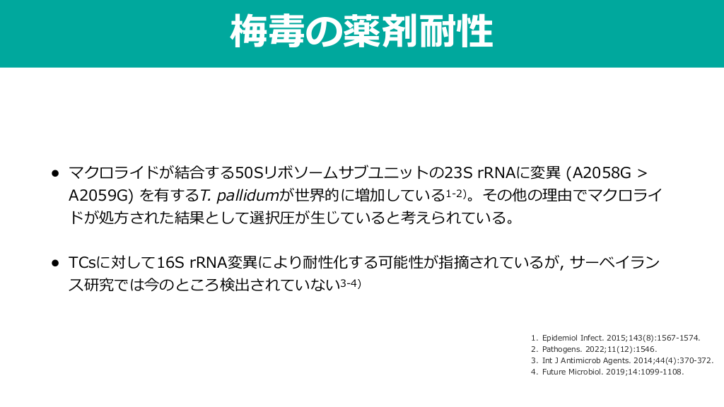 梅毒の薬剤耐性 • マクロライドが結合する50Sリボソームサブユニットの23S rRNAに変異 (A2058G > A2059G) を有するT. pallidumが世界的に増加している1-2)。その他の理由でマクロライ ドが処 された結果として選択圧が じていると考えられている。 • TCsに対して16S rRNA変異により耐性化する可能性が指摘されているが, サーベイラン ス研究では今のところ検出されていない3-4) 生 方 1. 2. 3. 4. Epidemiol Infect. 2015;143(8):1567-1574. Pathogens. 2022;11(12):1546. Int J Antimicrob Agents. 2014;44(4):370-372. Future Microbiol. 2019;14:1099-1108. #37.