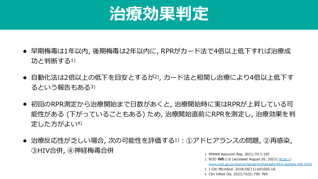 • 早期梅毒は1年以内, 後期梅毒は2年以内に, RPRがカード法で4倍以上低下すれば治療成 功と判断する1) • 動化法は2倍以上の低下を 安とするが2), カード法と相関し治療により4倍以上低下す るという報告もある3) • 初回のRPR測定から治療開始まで 数があくと, 治療開始時に実はRPRが上昇している可 能性がある (下がっていることもある) ため, 治療開始直前にRPRを測定し, 治療効果を判 定した がよい4) • 治療反応性が乏しい場合, 次の可能性を評価する1):①アドヒアランスの問題, ②再感染, ③HIV合併, ④神経梅毒合併 1. MMWR Recomm Rep. 2021;70:1-187. 日 目 2. NIID 梅毒とは (accessed August 26, 2023) https:// www.niid.go.jp/niid/ja/kansennohanashi/465-syphilis-info.html 3. J Clin Microbiol. 2018;56(11):e01003-18. 4. Clin Infect Dis. 2023;76(5):795-799. 方 自 治療効果判定 #39.