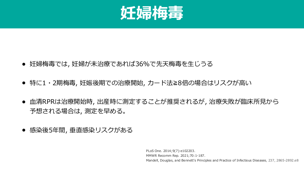 • 妊婦梅毒では, 妊婦が未治療であれば36%で先天梅毒を • 特に1・2期梅毒, 妊娠後期での治療開始, カード法≧8倍の場合はリスクが • 清RPRは治療開始時, 出産時に測定することが推奨されるが, 治療失敗が臨床所 予想される場合は, 測定を早める。 • 感染後5年間, 垂直感染リスクがある じうる い から PLoS One. 2014;9(7):e102203. 見 高 MMWR Recomm Rep. 2021;70:1-187. Mandell, Douglas, and Bennett's Principles and Practice of Infectious Diseases, 237, 2865-2892.e8 生 血 妊婦梅毒 #40.