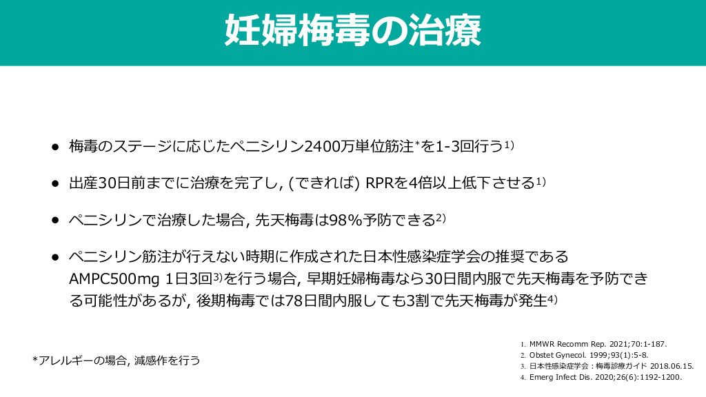 • 梅毒のステージに応じたペニシリン2400万単位筋注*を1-3回 う1) • 出産30 • ペニシリンで治療した場合, 先天梅毒は98%予防できる2) • ペニシリン筋注が えない時期に作成された 本性感染症学会の推奨である AMPC500mg 1 3回3)を う場合, 早期妊婦梅毒なら30 間内服で先天梅毒を予防でき る可能性があるが, 後期梅毒では78 間内服しても3割で先天梅毒が発 4) 前までに治療を完了し, (できれば) RPRを4倍以上低下させる1) 1. MMWR Recomm Rep. 2021;70:1-187. 2. Obstet Gynecol. 1999;93(1):5-8. 3. 本性感染症学会:梅毒診療ガイド 2018.06.15. 4. Emerg Infect Dis. 2020;26(6):1192-1200. 生 行 日 日 う 日 行 行 行 日 *アレルギーの場合, 減感作を 日 日 妊婦梅毒の治療 梅毒患者のパートナーへの対応 #41.