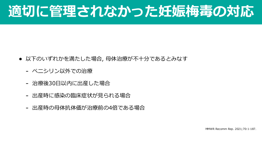 適切に管理されなかった妊娠梅毒の対応 • 以下のいずれかを満たした場合, - ペニシリン以外での治療 - 治療後30 - 出産時に感染の臨床症状が - 出産時の 体治療が不 分であるとみなす 以内に出産した場合 られる場合 体抗体価が治療前の4倍である場合 十 母 見 日 母 MMWR Recomm Rep. 2021;70:1-187. #45.
