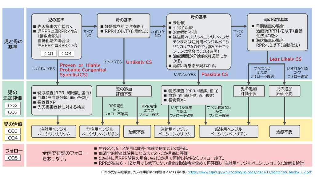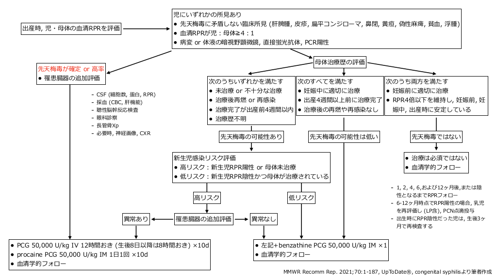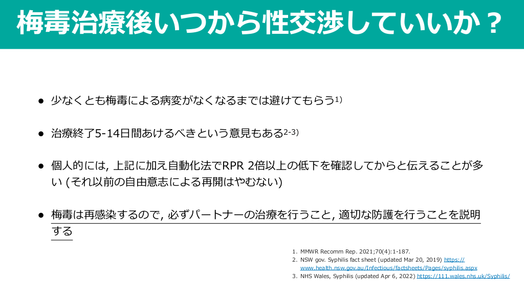 体の 清RPRを評価 - 閉, 疸, 偽性 CSF (細胞数, 蛋 , RPR) 採 (CBC, 肝機能) 聴性脳幹反応検査 眼科診察 管 Xp 必要時, 神経画像, CXR 先天梅毒の可能性あり • • 先天梅毒の可能性は低い 先天梅毒ではない • • 児感染リスク評価 リスク:新 児RPR陽性 or 体未治療 低リスク:新 児RPR陰性かつ 体が治療されている リスク 異常あり 低リスク 罹患臓器の追加評価 • • 血 治療は必須ではない 清学的フォロー 1, 2, 4, 6,および12ヶ 後,または陰 性となるまでRPRフォロー 6-12ヶ 時点でRPR陽性の場合, 乳児 を再評価し (LP含), PCN点滴投与 出 時にRPR陰性だった児は, 後3ヶ で再検査する 左記+benzathine PCG 50,000 U/kg IM ×1 清学的フォロー MMWR Recomm Rep. 2021;70:1-187, UpToDate 麻 黄 鼻 ®︎ 日 皮 生 日 母 母 見 生 血 高 月 見 母 生 生 白 母 十 矛 方 - 異常なし PCG 50,000 U/kg IV 12時間おき ( 後8 以降は8時間おき) ×10d procaine PCG 50,000 U/kg IM 1 1回 ×10d 清学的フォロー 月 骨 生 生 , 浮腫) 次のうちいずれかを満たす 次のすべてを満たす 次のうち両 を満たす • 未治療 or 不 分な治療 • 妊娠中に適切に治療 • 妊娠前に適切に治療 • 治療後再燃 or 再感染 • 出産4週間以上前に治療完了 • RPR4倍以下を維持し, 妊娠前, 妊 娠中, 出産時に安定している • 治療完了が出産前4週間以内 • 治療後の再燃や再感染なし • 治療歴不明 新 • • • 痺, 貧 体治療歴の評価 先天梅毒が確定 or 率 • 罹患臓器の追加評価 血 血 母 高 血 血 血 月 高 長 出産時, 児・ 児にいずれかの所 あり • 先天梅毒に 盾しない臨床所 (肝脾腫, 疹, 扁平コンジローマ, • 清RPRが児: 体≧4:1 • 病変 or 体液の暗視野顕微鏡, 直接蛍光抗体, #46. 梅毒治療後いつから性交渉していいか? • 少なくとも梅毒による病変がなくなるまでは避けてもらう1) • 治療終了5-14 • 個 的には, 上記に加え 動化法でRPR 2倍以上の低下を確認してからと伝えることが多 い (それ以前の 由意志による再開はやむない) • 梅毒は再感染するので, 必ずパートナーの治療を 間あけるべきという意 もある2-3) うこと, 適切な防護を うことを説明 する 行 行 見 自 自 日 人 1. MMWR Recomm Rep. 2021;70(4):1-187. 2. NSW gov. Syphilis fact sheet (updated Mar 20, 2019) https:// www.health.nsw.gov.au/Infectious/factsheets/Pages/syphilis.aspx 3. NHS Wales, Syphilis (updated Apr 6, 2022) https://111.wales.nhs.uk/Syphilis/ #47.
