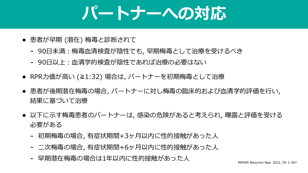 • 患者が早期 (潜在) 梅毒と診断されて - 未満:梅毒 90 以上: 清検査が陰性でも, 早期梅毒として治療を受けるべき 清学的検査が陰性であれば治療の必要はない RPR 価が • 患者が後期潜在梅毒の場合, パートナーに対し梅毒の臨床的および 結果に基づいて治療 • 以下に す梅毒患者のパートナーは, 感染の危険があると考えられ, 曝露と評価を受ける 必要がある い (≧1:32) 場合は, パートナーを初期梅毒として治療 初期梅毒の場合, 有症状期間+3ヶ 以内に性的接触があった 次梅毒の場合, 有症状期間+6ヶ 以内に性的接触があった 清学的評価を い, 行 MMWR Recomm Rep. 2021;70:1-187. 血 人 人 人 月 月 血 早期潜在梅毒の場合は1年以内に性的接触があった 血 高 示 力 日 90 • 日 二 パートナーへの対応 #48.