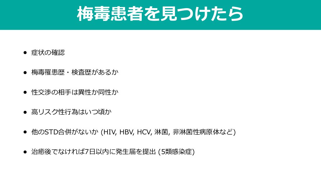 • 症状の確認 • 梅毒罹患歴・検査歴があるか • 性交渉の相 • リスク性 為はいつ頃か 治癒後でなければ7 淋菌性病原体など) 非 以内に発 届を提出 (5類感染症) 生 見 • 日 他のSTD合併がないか (HIV, HBV, HCV, 淋菌, 手 つけたら は異性か同性か • 行 高 梅毒患者を