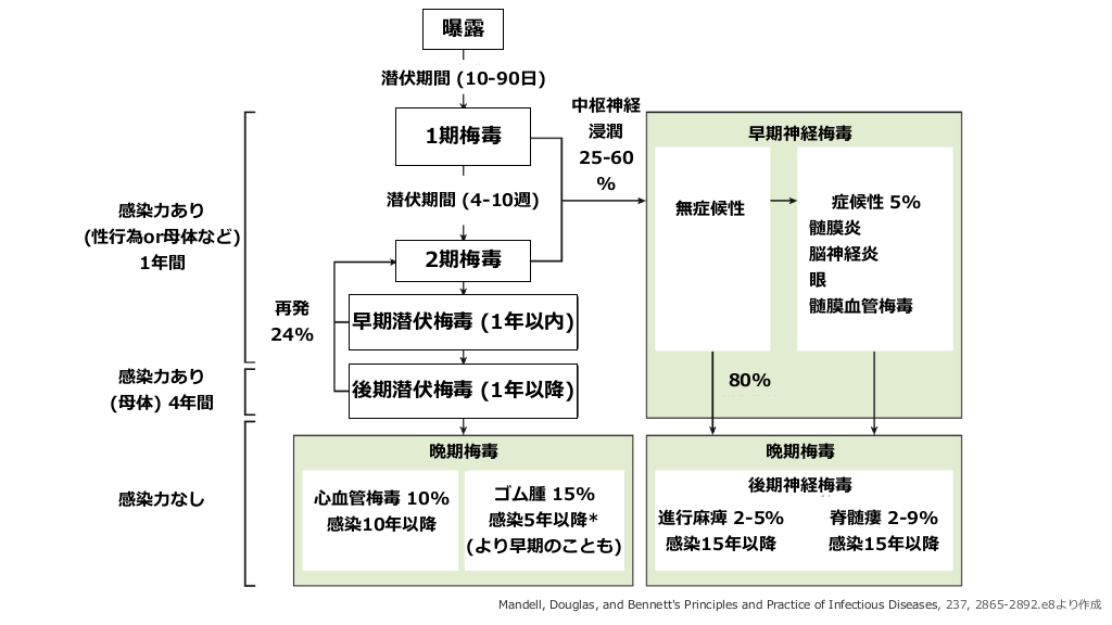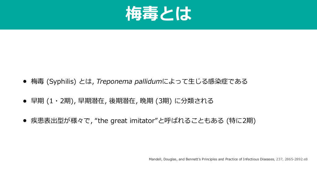 梅毒とは • 梅毒 (Syphilis) とは, Treponema pallidumによって • 早期 (1・2期), 早期潜在, 後期潜在, 晩期 (3期) に分類される • 疾患表出型が様々で, “the great imitator”と呼ばれることもある (特に2期) じる感染症である 生 Mandell, Douglas, and Bennett's Principles and Practice of Infectious Diseases, 237, 2865-2892.e8 #6.