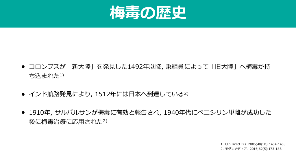 梅毒の歴史 • コロンブスが「新 ち込まれた1) • インド航路発 • 1910年, サルバルサンが梅毒に有効と報告され, 1940年代にペニシリン単離が成功した 後に梅毒治療に応 された2) 陸」を発 した1492年以降, 乗組員によって「旧 により, 1512年には 陸」へ梅毒が持 本へ到達している2) 大 日 見 大 用 見 1. Clin Infect Dis. 2005;40(10):1454-1463. 2. モダンメディア.2016;62(5):173-183. #8.