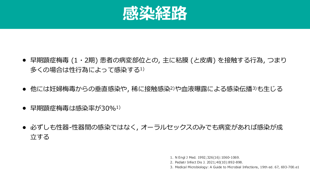 • 早期顕症梅毒 (1・2期) 患者の病変部位との, 主に粘膜 (と 多くの場合は性 為によって感染する1) • 他には妊婦梅毒からの垂直感染や, 稀に接触感染2)や • 早期顕症梅毒は感染率が30%1) • 必ずしも性器-性器間の感染ではなく, オーラルセックスのみでも病変があれば感染が成 する 膚) を接触する 為, つまり 液曝露による感染伝播3)も じる 生 行 皮 血 1. N Engl J Med. 1992;326(16):1060-1069. 2. Pediatr Infect Dis J. 2021;40(10):892-898. 3. Medical Microbiology: A Guide to Microbial Infections, 19th ed. 67, 693-700.e1 行 立 感染経路 トレポネーマ試験の種類と解釈 #11.