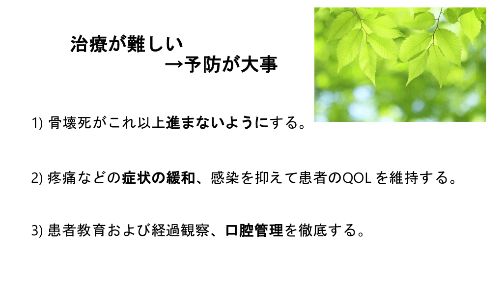 #10. 治療が難しい →予防が大事 1) 骨壊死がこれ以上進まないようにする。 2) 疼痛などの症状の緩和、感染を抑えて患者のQOL を維持する。 3) 患者教育および経過観察、口腔管理を徹底する。