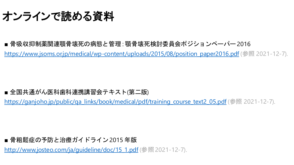 #3. ビスフォスフォネート・デノスマブ等の薬剤を使う疾患 骨粗鬆症 固形がん(乳がん・前立腺がん・肺がん・甲状腺がん・腎がん等)の骨転移 多発性骨髄腫等 悪性腫瘍に伴う高カルシウム血症 パジェット病など過剰な骨量減少を特徴とする疾患の治療 全国共通がん医科歯科連携講習会テキスト(第二版)2019. Estee L. Bone Reports. Bisphosphonate-related osteonecrosis of the jaw: a mechanobiology perspective. 2018, Volume 8.