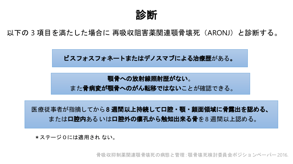 #4. 診断 以下の 3 項目を満たした場合に 再吸収阻害薬関連顎骨壊死(ARONJ)と診断する。 ビスフォスフォネートまたはデノスマブによる治療歴がある。 顎骨への放射線照射歴がない。 また骨病変が顎骨へのがん転移ではないことが確認できる。 医療従事者が指摘してから 8 週間以上持続して口腔・顎・顔面領域に骨露出を認める、 または口腔内ある いは口腔外の瘻孔から触知出来る骨を 8 週間以上認める。 *ステージ0には適用され ない。 骨吸収抑制薬関連顎骨壊死の病態と管理 : 顎骨壊死検討委員会ポジションペーパー 2016.