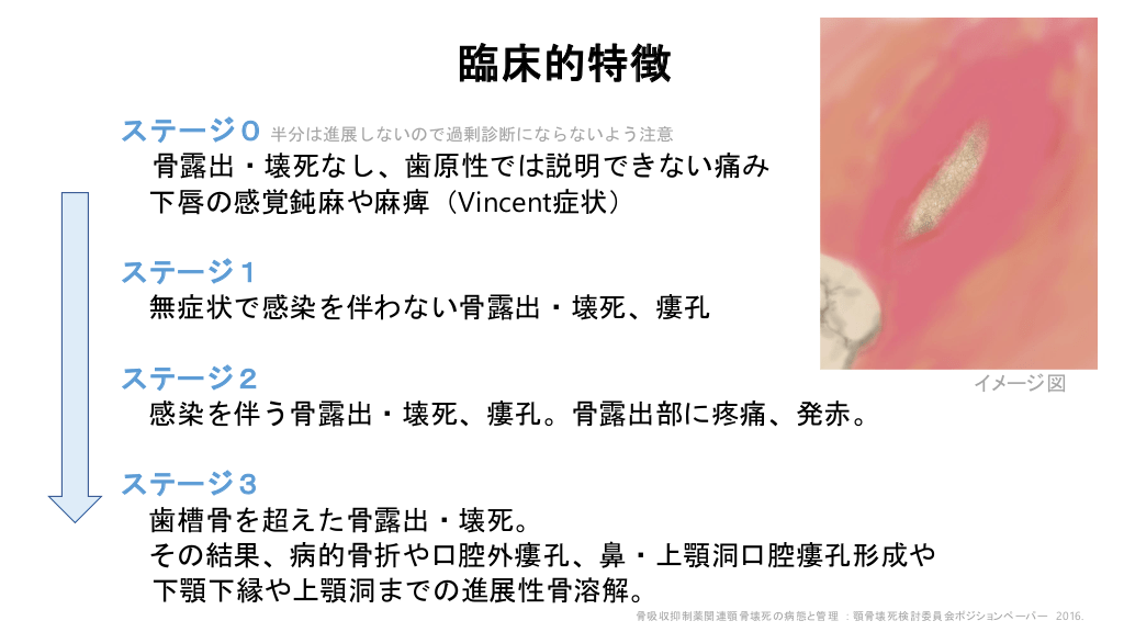 #5. 臨床的特徴 ステージ0 半分は進展しないので過剰診断にならないよう注意 骨露出・壊死なし、歯原性では説明できない痛み 下唇の感覚鈍麻や麻痺(Vincent症状) ステージ1 無症状で感染を伴わない骨露出・壊死、瘻孔 ステージ2 感染を伴う骨露出・壊死、瘻孔。骨露出部に疼痛、発赤。 イメージ図 ステージ3 歯槽骨を超えた骨露出・壊死。 その結果、病的骨折や口腔外瘻孔、鼻・上顎洞口腔瘻孔形成や 下顎下縁や上顎洞までの進展性骨溶解。 骨吸収抑制薬関連顎骨壊死の病態と管理 : 顎骨壊死検討委員会ポジションペーパー 2016.