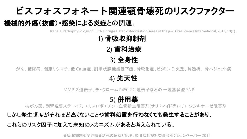 #6. ビスフォスフォネート関連顎骨壊死のリスクファクター 機械的外傷(抜歯)・感染による炎症との関連。 Ikebe T. Pathophysiology of BRONJ: drug-related osteoclastic disease of the jaw. Oral Science International, 2013, 10(1). 1) 骨吸収抑制剤 2) 歯科治療 3) 全身性 がん、糖尿病、関節リウマチ、低 Ca 血症、副甲状腺機能低下症、骨軟化症、ビタミン D 欠乏、腎透析、 骨パジェット病 4) 先天性 MMP-2 遺伝子、チトクローム P450-2C 遺伝子などの 一塩基多型 SNP 5) 併用薬 抗がん薬、副腎皮質ステロイド、エリスロポエチン ・血管新生阻害剤(サリドマイド等) ・チロシンキナーゼ阻害剤 しかし発生頻度がそれほど高くないことや歯科処置を行わなくても発生することがあり、 これらのリスク因子に加えて未知のメカニズムがあると考えられている。 骨吸収抑制薬関連顎骨壊死の病態と管理 : 顎骨壊死検討委員会ポジションペーパー 2016.