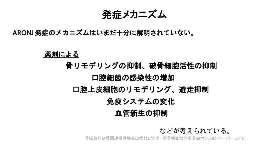 #2. 骨に関する薬剤による顎骨壊死がある ビスフォスフォネートを使っている患者に難治性の顎骨壊死が発生する2003年の報告。 :ビスフォスフォネート関連顎骨壊死(BRONJ)Marx, R. E. Pamidronate (Aredia) and zoledronate (Zometa) induced avascular necrosis of the jaws: a growing epidemic. Journal of oral and maxillofacial surgery, 2003, 61(9). 新たな治療薬として登場したデノスマブはビスホスホネートより半減期が短く、骨に沈着せず、破 骨細胞にアポトーシスを誘導しない…が、同様の頻度で起きることが判明。 :デノスマブ関連顎骨壊死(DRONJ) メカニズムが異なっても顎骨壊死が起きることからこの2つを包括して再吸収阻害薬関連顎骨壊死 (ARONJ)と呼称。 さらに抗がん薬とよく併用される血管新生阻害薬、分子標的治療薬、特にチロシンキナーゼ阻害薬 などの投与を受けている症例でよく起きるので米国口腔顎顔面外科学会(AAOMS)は薬剤関連顎骨 壊死(MRONJ)とした。