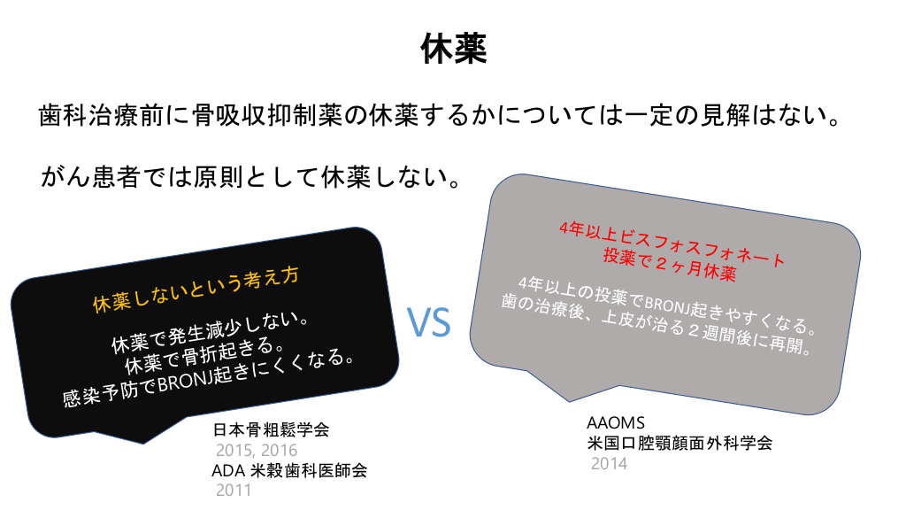 #9. 休薬 歯科治療前に骨吸収抑制薬の休薬するかについては一定の見解はない。 がん患者では原則として休薬しない。 VS 日本骨粗鬆学会 2015, 2016 ADA 米穀歯科医師会 2011 AAOMS 米国口腔顎顔面外科学会 2014
