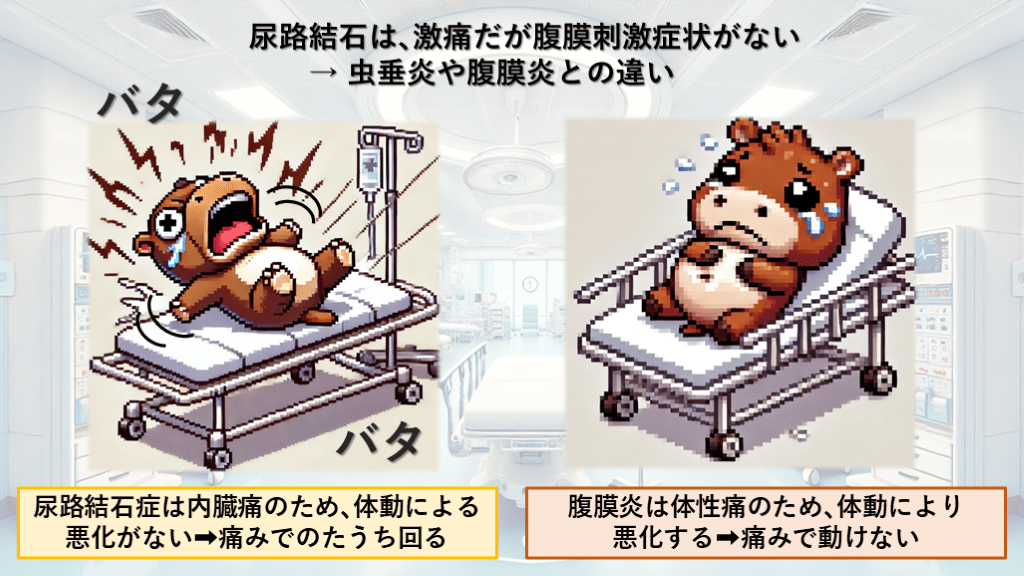 → 虫垂炎や腹膜炎との違い 尿路結石症は内臓痛のため、体動による悪化がない➡痛みでのたうち回る 腹膜炎は体性痛のため、体動により悪化する➡痛みで動けない バタ バタ