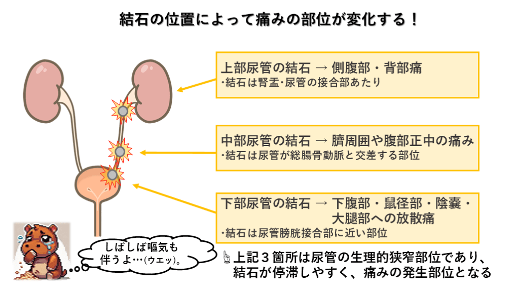 ・結石は腎盂・尿管の接合部あたり 結石の位置によって痛みの部位が変化する! しばしば嘔気も伴うよ…(ウエッ)。 ☝上記3箇所は尿管の生理的狭窄部位であり、