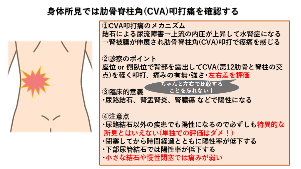 結石による尿流障害→上流の内圧が上昇して水腎症になる→腎被膜が伸展され肋骨脊柱角(CVA)叩打で疼痛を感じる