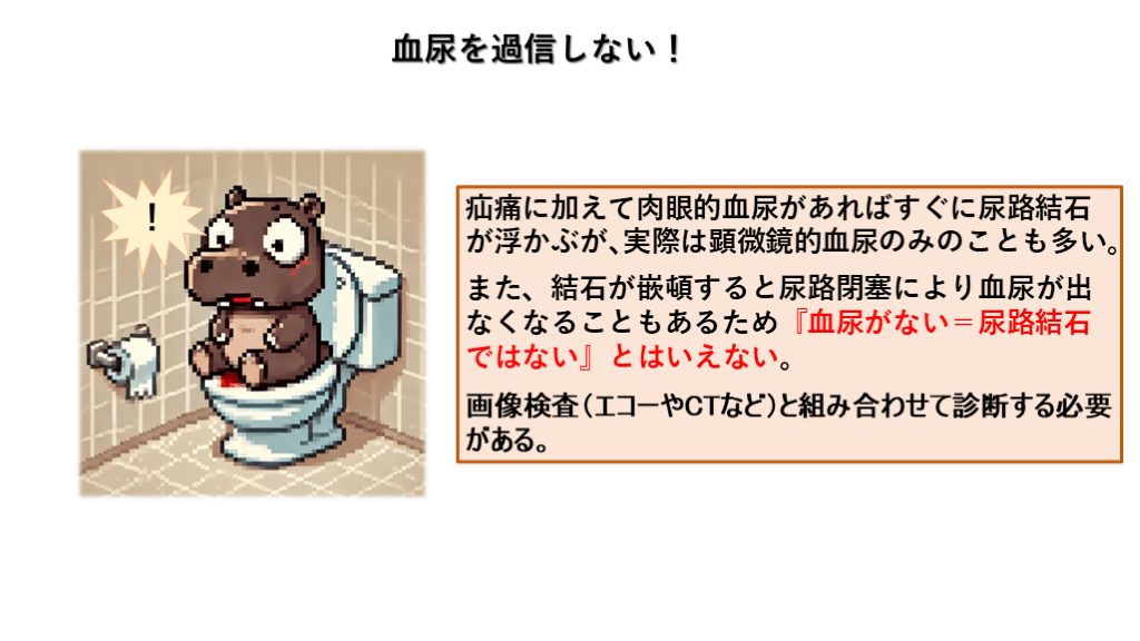 また、結石が嵌頓すると尿路閉塞により血尿が出なくなることもあるため『血尿がない=尿路結石ではない』とはいえない。