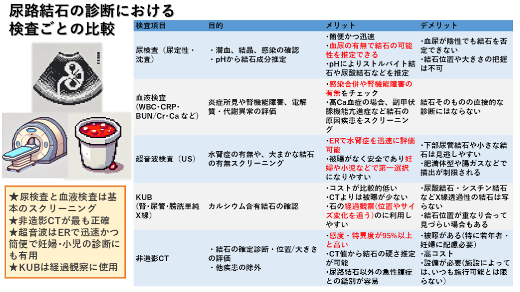 検査ごとの比較 ★尿検査と血液検査は基本のスクリーニング★非造影CTが最も正確