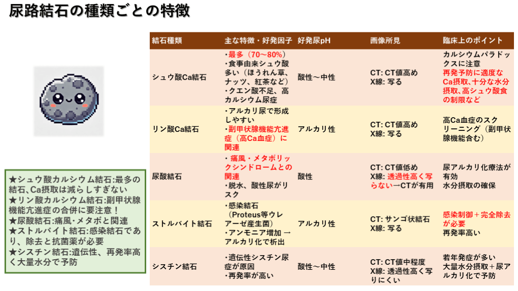 #13. 尿路結石の種類ごとの特徴 ★シュウ酸カルシウム結石:最多の結石、Ca摂取は減らしすぎない