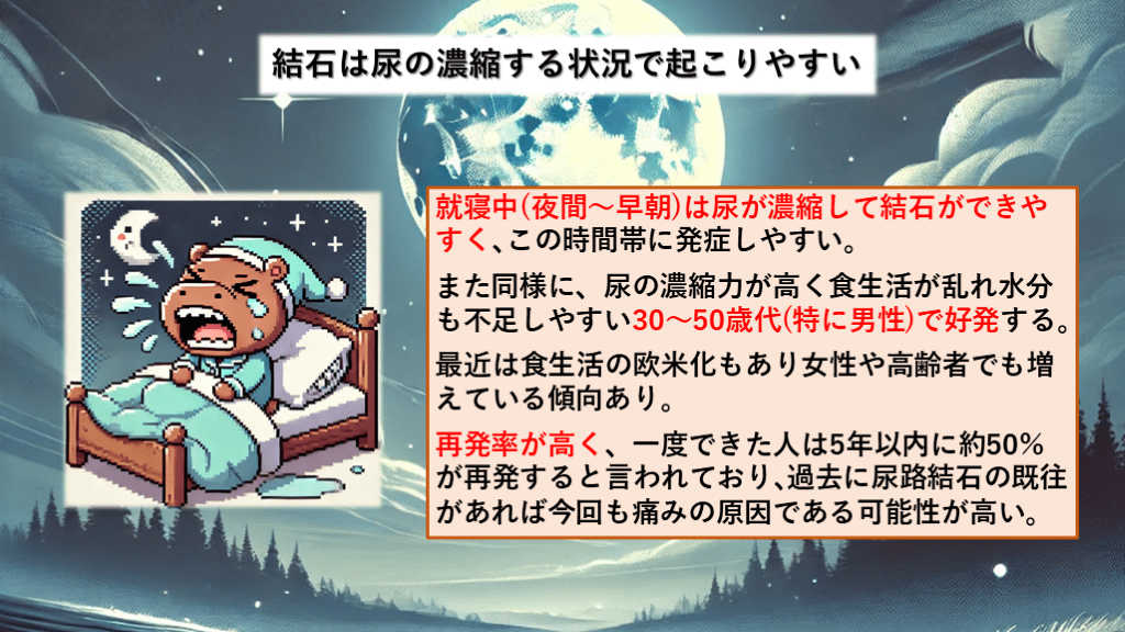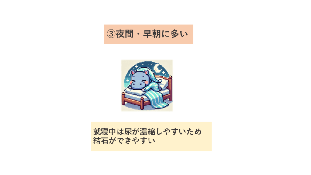 結石は尿の濃縮する状況で起こりやすい 就寝中(夜間~早朝)は尿が濃縮して結石ができやすく、この時間帯に発症しやすい。