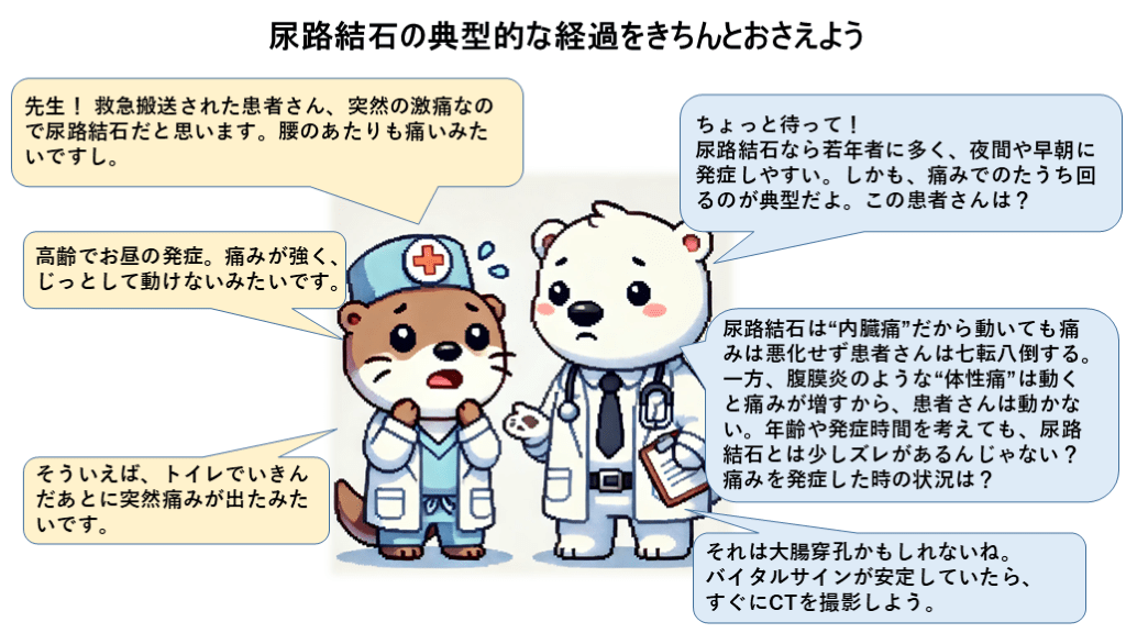 尿路結石なら若年者に多く、夜間や早朝に発症しやすい。しかも、痛みでのたうち回るのが典型だよ。この患者さんは? 先生! 救急搬送された患者さん、突然の激痛なので尿路結石だと思います。腰のあたりも痛いみたいですし。 高齢でお昼の発症。痛みが強く、じっとして動けないみたいです。 尿路結石は“内臓痛”だから動いても痛みは悪化せず患者さんは七転八倒する。一方、腹膜炎のような“体性痛”は動くと痛みが増すから、患者さんは動かない。年齢や発症時間を考えても、尿路結石とは少しズレがあるんじゃない?